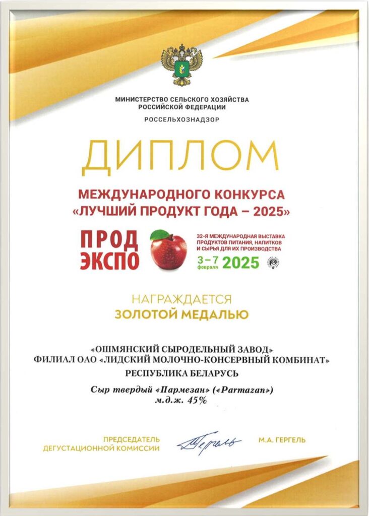Продукция “Ошмянского сыродельного завода” в очередной раз удостоенная признания и  высоких наград на 32-ой международной выставке продуктов питания, напитков и сырья для производства ПРОДЭКСПО, которая прошла в Москве.